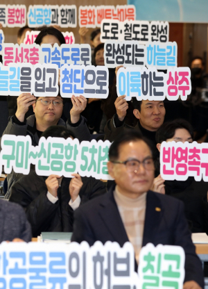 대구·경북공항 범도민추진위원회 관계자들이 3일 오후 경북 칠곡상공회의소에서 열린 전체 회의에서 신공항의 조속한 건설을 위한 정부 지원을 촉구하고 있다. 기사발신지=연합뉴스, 연합뉴스 사진..