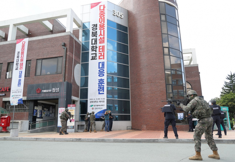 경북대 다중이용시설 테러 대응 8개 기관 100여명 참여 훈련 대구 북구청은 지난 19일 오후 3시 경북대학교에서 2025년을지연습 실제훈련인 다중이용시설 테러 대응 훈련을 실시했다.이번 훈련에는 북구청 주관으로 경북대학교를 비롯해 8251-1대대, 19화생방대대, 북부경찰서, 북부소방서, 산격3동, 복현1동 등 8개 기관 100여 명이 참여하고, 8251-1대대 코란도, 19화생방대대 솔라티, 경찰 순찰차, 경찰 콤비버스, 소방 펌프차, 구급차 등 차량 8대가 동원되었다.이날 훈련은 경북대학교 복지관 외부에서 미상의 백색가루가 식별되면서 19화생방대대가 신속히 출동하여 백색가루를 처리하였고, 이후 복지관 내부에 침투한 테러범 2명이 인질극과 총격전을 벌이는 상황으로 전개되었다.경북대학교에서는 주민들을 신속히 대피시키고, 북부경찰서와 8251-1대대는 긴밀한 합동작전을 통해 적 테러범을 진압하였다. 테러범이 설치한 시한폭탄으로 화재가 발생하였으나, 북부소방서의 신속한 초동조치로 화재가 진압되었고 복지관 내부에 남아있던 부상자를 병원으로 안전하게 후송하였다. 이어서 진행된 119안전센터 대원들의 안전한 소화기 사용법 교육을 마지막으로 실제훈련이 마무리되었다.배광식 북구청장은 훈련 강평에서 “무더운 날씨 속에서도 훈련에 적극 참여해 주신 군부대를 비롯한 여러 유관기관과 산격3동, 복현1동 주민들, 그리고 훈련 장소를 지원해 주신 경북대학교에 감사드리며, 이번 훈련을 통해 민·관·군·경·소방의 유기적인 협력과 통합방위 태세의 중요성을 다시 한번 확인할 수 있었다”며, “실전과 같은 훈련을 통해 비상 상황에서 신속하고 정확하게 대응할 수 있는 역량을 강화하게 된 매우 뜻깊은 기회였다”고 말했다.장완익 기자