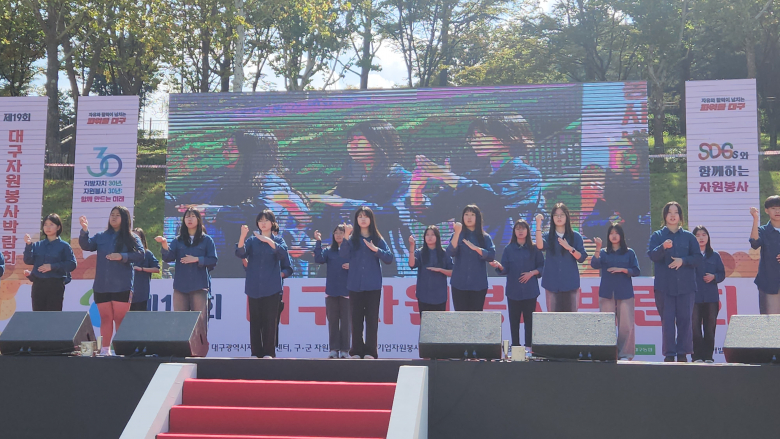 대구서부교육지원청(교육장 김규은)은 10월 25일 두류공원 2.28자유광장에서 열린 ‘대구자원봉사박람회’에 서구 지역 5개 중학교(경운중, 경일중, 중리중, 청라중, 평리중) 학생들로 구성된 초록봉사단 소속 ‘하모니수어합창단’ 41명이 참여했다.