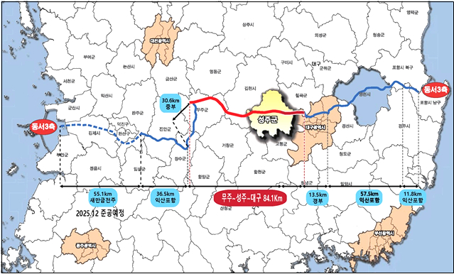 동서3축(새만금~포항) 고속도로는 서부권과 동부권을 직접 연결하는 국가 간선축으로, 2025년 11월 새만금~전주(L=55.1km) 구간이 개통되면, 무주~성주~대구 구간만이 미개통 상태로 남게 되어 현재까지 영호남 간 물류 이동과 산업 연계가 크게 제약을 받아왔다.