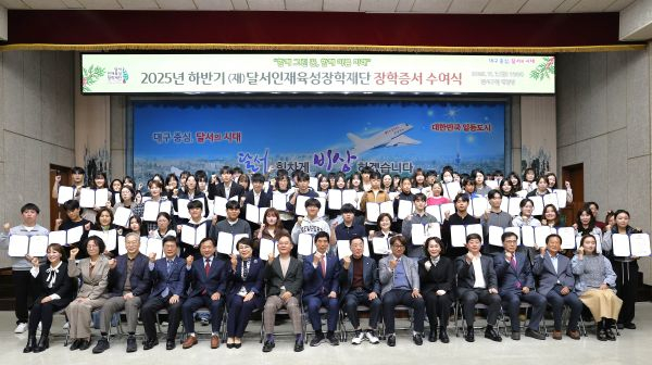 [대구=장완익 기자] 대구 달서구(구청장 이태훈)는 (재)달서인재육성장학재단(이사장 이태훈)이 구청 대강당에서 2025년 하반기 장학금 수여식을 개최했다고 13일 밝혔다.