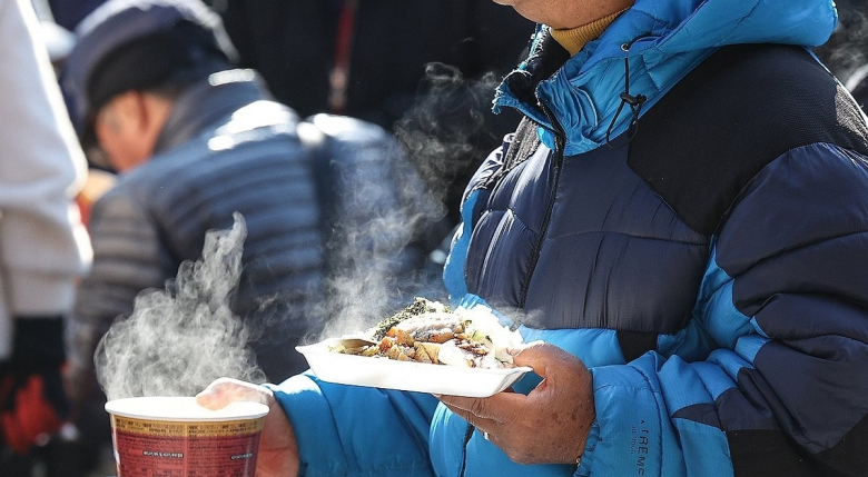 올가을 가장 추운 날씨를 보인 18일 대구 달서구 두류공원 사랑해밥차 무료 급식소에서 어르신들이 따뜻한 밥을 받아 이동하고 있다. 기사발신지=연합뉴스, 연합뉴스 사진