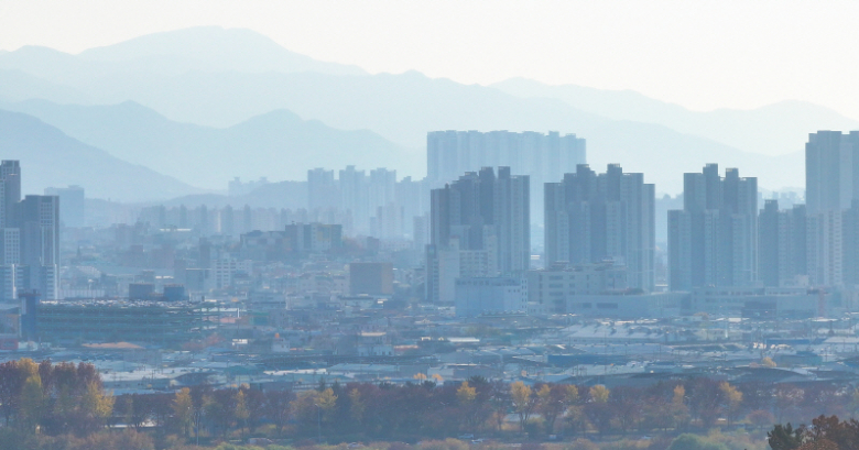 대구의 초미세먼지 농도가 나쁨 수준을 보인 24일 대구 도심의 숲과 가로수에 단풍이 든 가운데 초미세먼지로 인해 뿌옇게 보이고 있다.기사발신지=연합뉴스, 연합뉴스 사진