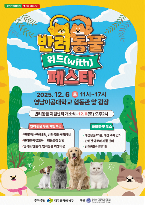 [대구=장완익 기자] 대구 남구(구청장 조재구)는 오는 12월 6일 토요일, 오전 11시부터 오후 5시까지 영남이공대학교 내 협동관 앞 광장에서 ‘대구 남구 반려동물 위드(with) 페스타’를 개최하고, 이 자리에서 대구 최초로 설립한 ‘남구반려동물지원센터’ 개소식을 함께 진행한다고 밝혔다.