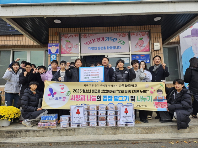 [영천=최은하 기자] 영천시 대창면 나무와중학교는 27일 대창면 행정복지센터에 학생들이 직접 담근 김장김치 30박스(75kg)와 ‘행복금고’ 성금 20만원을 기탁했다.이날 전달한 김장김치는 학교 텃밭에서 교사와 학생들이 정성껏 키운 배추로, 학생들이 김장에도 직접 나서 나눔의 의미가 더욱 깊었다.이주형 교장은 “학생들이 스스로 땀 흘려 기른 배추로 김치를 담그고, 그 김치가 어려운 이웃에게 전달된다는 사실만으로도 큰 교육적 의미가 있다”며, “앞으로도 지역과 함께하는 학교, 나눔을 실천하는 교육을 이어가겠다”고 말했다.박상우 대창면장은 “아이들의 정성과 따뜻한 마음이 그대로 담긴 김장과 성금이라 더욱 뜻깊고, 전달해주신 김치와 성금은 도움이 필요한 곳에 잘 전달하겠다”며, “매년 지역을 위해 따뜻한 나눔을 실천해주시는 나무와중학교에 깊이 감사드린다”고 전했다.한편, 나무와중학교는 2024년 전국 학교 최초로 산림청이 주관한 ‘모범 도시 숲 학교 숲 부분’에 선정됐으며, 최근 2025 국제유네스코 학교에도 지정됐다. 또한 매년 행복금고 성금을 기탁하고, 직접 재배한 배추로 김치를 담가 어려운 이웃들에게 전달하는 등 꾸준한 나눔을 실천하고 있다.