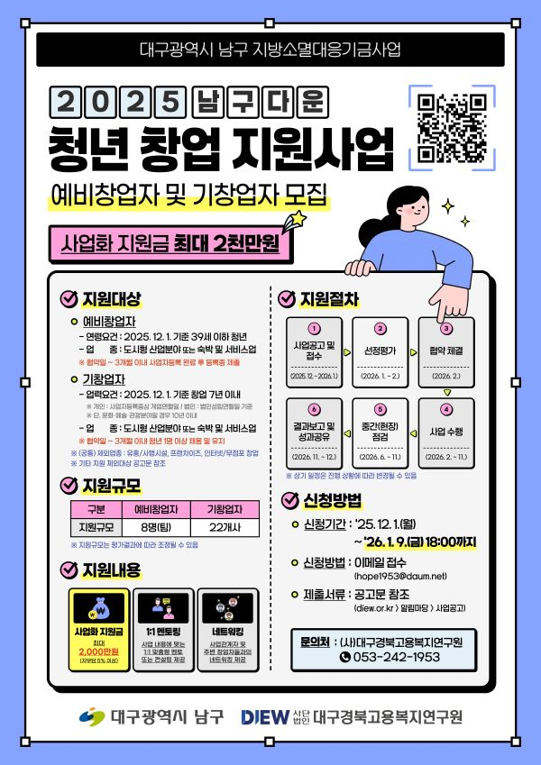 [대구=장완익 기자] 대구 남구(구청장 조재구)는 지역 청년들의 안정적인 창업 활동과 지역 상권 활성화를 도모하기 위해 ‘청년창업지원 2차 사업’을 추진하고, 2026년 1월 9일까지 참가자를 모집한다.