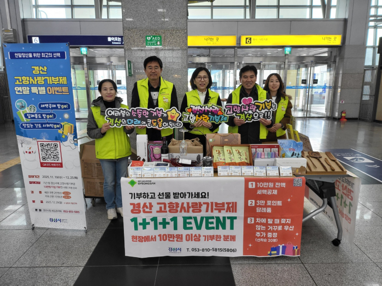 [경산=도순환 기자] 경산시(시장 조현일)는 19일 동대구역에서 승객들을 대상으로 고향사랑기부제 홍보물을 배부하고, 기부 답례품을 전시하는 등 연말 홍보활동을 전개했다.시는 12월 매주 수요일 경산역과 대구 지하철역에서 출퇴근 직장인들을 대상으로 지속적인 홍보를 이어왔으며, 최근에는 인근 대구광역시 수성구 고산동 내 70여 개 아파트 단지 게시판을 활용한 홍보를 실시하는 등 고향사랑기부제 참여 확산에 힘써왔다.정지영 징수과장은 “연말에 고향사랑기부제에 대한 관심이 높아지면서 12월 말 기부시스템이 원활하지 않은 경우가 있다. 기부를 계획하고 있는 분들은 25일 이전에 미리 참여해 주시길 바란다”고 당부했다.경산에 고향사랑기부를 하려면 ‘gslove.kr’에 접속하거나, 고향사랑e음(ilovegohyang.go.kr)으로 접속해 기부 지자체를 경산으로 선택한 후 기부금 납부 및 답례품을 선택하면 되고, 온라인 기부가 어려운 분들은 가까운 농협에서 납부할 수 있다. 끝.