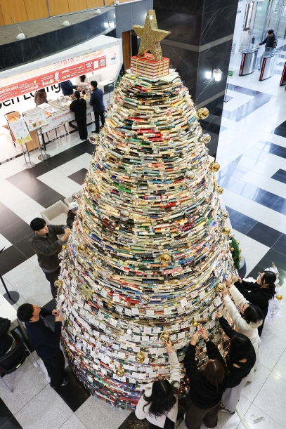 [기사발신지=연합뉴스, 연합뉴스 사진]16일 대구대학교 경산캠퍼스 창파도서관에서 재학생들이 크리스마스를 앞두고 설치된 북(Book) 트리에 소원지를 붙이고 있다. 북 트리는 크리스마스를 앞두고 도서관 활성화를 위해 조성됐으며, 폐기 예정인 도서 4천권을 활용해 높이 5m, 폭 3m 규모로 설치됐다. 기사발신지=연합뉴스, 연합뉴스 사진