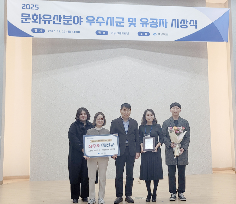 [예천=도순환 기자] 예천군은 22일 안동 그랜드호텔에서 열린 경북도 주관 ‘2025년 시·군 문화유산분야 평가’에서 최우수상을 수상하는 쾌거를 이루었다. 지난 2023년 최우수상, 2024년 특별상에 이어 2025년 최우수상까지 3년 연속 수상으로 문화유산 보존·관리·활용 분야에서 높이 평가받고 있다.