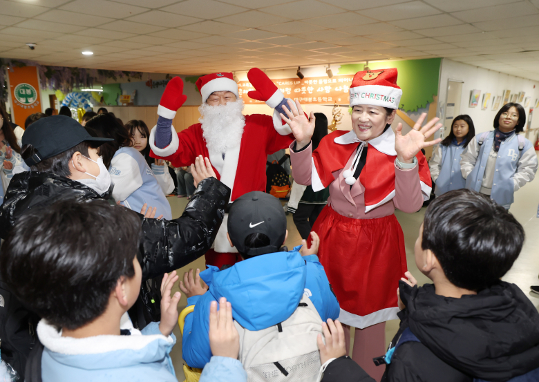 대구대봉초등학교(교장 우경돈)는 12월 24일, 성탄절과 겨울방학을 앞두고 강은희 교육감이 참석해‘CARES UP 사랑 나눔 DAY’를 운영했다. 이번 행사는 한 해 동안 열심히 공부한 학생들을 격려하고, 다가오는 겨울방학을 즐겁고 안전하게 맞이하기를 바라는 마음을 담아 마련됐다. 이날 강은희 교육감은 직접 산타클로스 복장을 하고 등교하는 학생 한 명 한 명에게 따뜻한 인사를 건냈다.