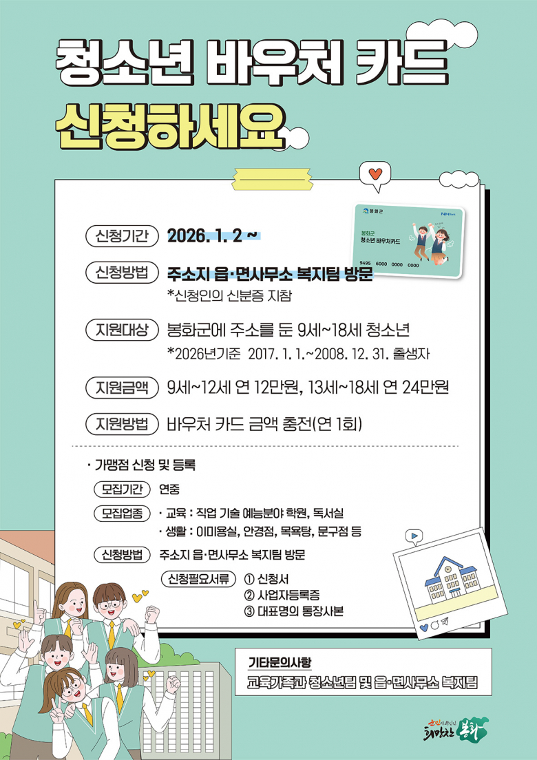[봉화=전상기 기자]봉화군은 지역 청소년의 건강한 성장 발달과 복지 증진을 위해 2026년 1월 2일부터 봉화군 청소년 바우처 카드 신청을 받는다.