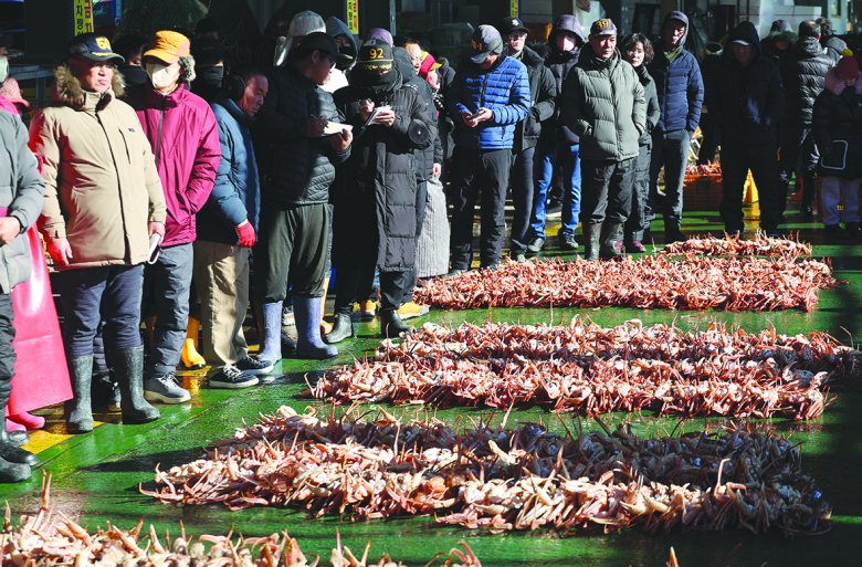 [기사발신지=연합뉴스, 연합뉴스 사진]2일 경북 영덕군 강구항에서 열린 대게 경매장에서 관계자들이 경매를 준비하고 있다.