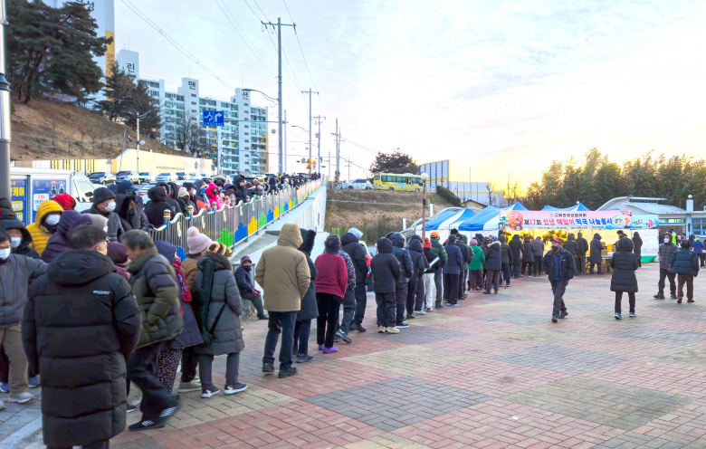 새해 첫날인 1일 오전, 경북 칠곡군 왜관소공원에서 열린 신년 해맞이 떡국 나눔 행사에서 자고산 해맞이를 마친 주민들이 떡국을 받기 위해 100m가 넘는 줄을 서 있다.