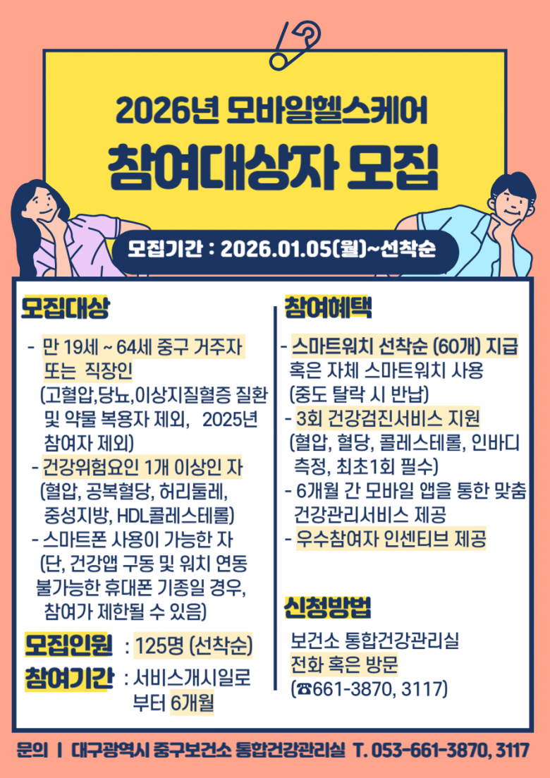 대구 중구(구청장 류규하)는 스마트폰과 활동량계를 활용해 개인 맞춤형 건강관리를 지원하는 ‘2026년 모바일 헬스케어 사업’ 참여자 125명을 선착순으로 모집한다.