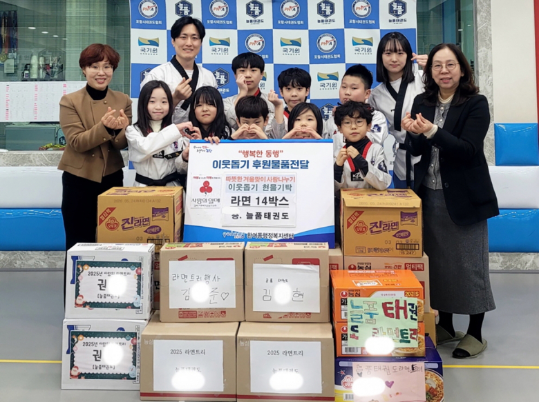 포항시 북구 환호동에 소재한 늘품태권도장은 연초를 맞아 겨울철 어려운 이웃을 돕기 위해 지난 16일 환여동행정복지센터에 라면 14상자를 기탁하며 이웃사랑을 실천했다.이번 사랑의 라면 기부는 늘품태권도장 원생들이 이웃과 따뜻한 정을 나누기 위해 스스로 마련한 것으로, 아이들이 한 달여 동안 십시일반 정성껏 모은 라면으로 준비됐다. 늘품태권도장은 해마다 원생들과 함께 나눔활동을 이어오며 지역사회에 따뜻한 귀감이 되고 있다.