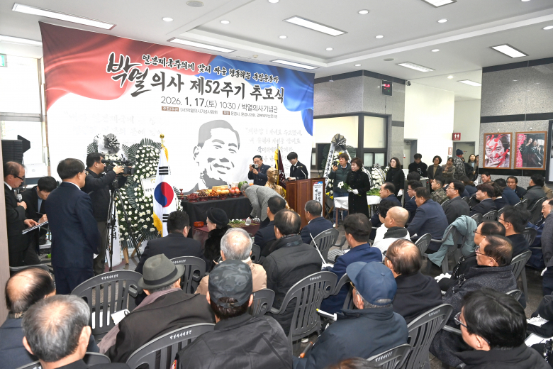 독립운동가 박열 의사 제52주기 추모식이 17일 오전 10시 30분, 박열의사기념관에서 성황리에 봉행됐다. 이날 추모식에는 박열의사의 손자와 유족를 비롯한 신현국 문경시장, 이정걸 시의회 의장, 시·도의원, 이규봉 문경경찰서장, 신동성 문경예천대대장, 박인원 前기념사업회 이사장, 박경규 노인회 문경시지회장, 지역 안보보훈단체장, 지역 유림단체장, 시민 등 200여 명이 참석해 그의 숭고한 애국정신을 기렸다. 박열의사는 1902년 경북 문경에서 태어나 3·1운동에 참여한 뒤 일본으로 건너가 아나키스트 독립운동에 투신했다. 1926년 일왕 폭살기도 혐의로 사형을 선고받았다가 무기징역으로 감형되어 22년 2개월간 옥고를 치렀다. 이는 독립운동가 가운데 최장 수감 기록으로, 그는 일본 제국주의의 심장부에서 투쟁한 행동하는 독립운동가이자 사상가로 평가받는다. 해방 이후에도 재일교포의 권익 신장을 위해 재일본조선거류민단을 조직하여 단장(초대~5대)을 역임하는 등 민족운동에 헌신하였다. 이후 6·25 전쟁 당시 북한으로 강제 피랍되어 1974년 1월 17일, 향년 73세를 일기로 파란만장한 삶을 마감하였으며, 대한민국 정부는 그의 공적을 기려 1989년 건국훈장 대통령장을 추서하였다. 이날 식전 행사는 박열의사의 생전 애창곡인 ‘이별의 부산정거장’ 등이 문경문화원 하모니카 동아리의 연주로 울려 퍼지며 추모 분위기를 조성했다. 본 행사는 국민의례를 시작으로 추모사, 추모 글 낭독, 추모헌시 액자 기증 및 헌시 낭독, 헌화 및 분향, 만세삼창 등으로 진행되었다. 특히 박열의사의 모교인 함창초등학교 남·여 학생 대표가 선배의 애국정신을 기리고자 직접 작성한 추모 글을 낭독하여 참석자들의 호응을 얻었다.