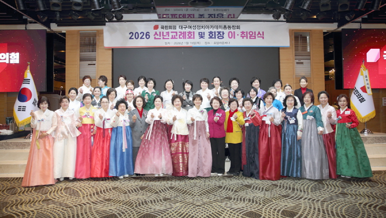 국민의힘 대구여성정치아카데미총동창회 19대 회장에 이정득 회장이 취임했다.지난 15일(목) 오전 11시, 라온제나호텔에서 개최된‘대구여성정치아카데미총동창회 2026 신년교례회 및 회장 이.취임식’에 추경호 ‧ 최은석 국회의원을 비롯한 류규하 ‧ 조재구 ‧ 배광식 ‧ 김대권 구청장, 대구시의회 이재화 부의장, 주요당직자와 회원 등 200여명이 참석했다.
