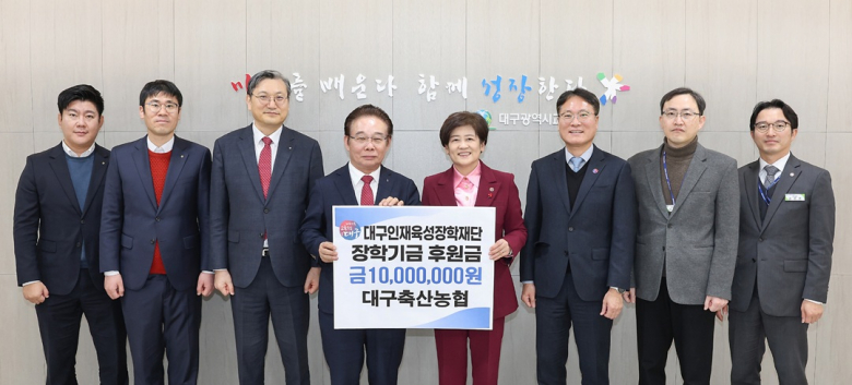 대구시교육청은 1월 16일(금), 대구축산농협(조합장 최성문)에서 대구인재육성장학재단에 장학금 1천만 원을 기탁한다고 밝혔다. 대구축산농협은 대구 전역의 자치단체 및 복지재단과 협력해 봉사활동, 생활물자지원 등‘지역사랑 나눔운동’을 실천해 오고 있으며, 지역 인재 육성을 위한 뜻깊은 나눔에 동참하고자 2019년부터 매년 대구인재육성장학재단에 장학금을 기탁하고 있다. 최성문 조합장은 “경제적으로 어려운 환경에 처한 학생들에게 꾸준히 장학금을 지원할 수 있도록 앞으로 더 살피고 노력하겠다.”는 뜻을 전했다. 강은희 교육감은 “학생들이 꿈과 희망을 갖고 학업에 매진할 수 있도록 도움을 주신 대구축산농협 조합장님을 비롯한 직원 여러분께 감사드린다.”며 “기탁한 장학금을 잘 활용해 학생들이 미래 인재로 성장할 수 있도록 최선을 다하겠다.”라고 말했다.황태용 기자
