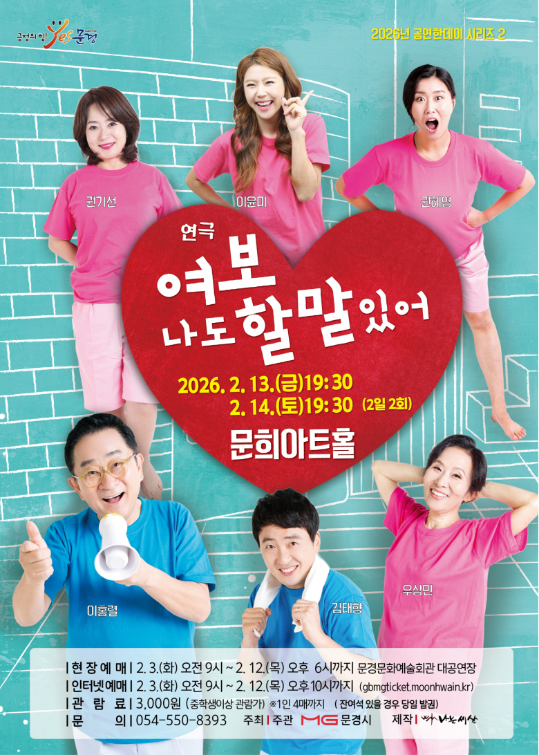 문경문화예술회관에서는 삶의 무게를 유머와 따뜻한 시선으로 풀어낸 힐링 연극 여보 나도 할 말 있어 공연을 2월 13일(금) 19:30, 14(토) 19:30 (2일2회)에 문희아트홀에서 개최한다.이번 공연은 찜질방에서 만난 6명의 중년 남녀가 우리 주변에서 흔히 경험했을 법한 이야기를 서로 나누면서 전개되며 중년에 삶의 애환과 고민을 털어놓는 드라마 형식의 연극이다.배우들이 펼쳐내는 솔직한 대화와 수다는 때로는 폭소를 때로는 뭉클한 울림을 선사하며 실제 중년들의 이야기를 현실성 있게 풀어내 관객으로 하여금 가족과 나 자신을 다시 바라보게 하는 시간을 선물한다. 문경 공연에서는 방송, 드라마, 연극, 뮤지컬등 다양한 무대에서 활동하고 있는 이홍렬, 우상민, 권기선, 김태향, 이윤미, 권혜영 배우가 출연할 예정이다.입장권은 전석 3,000원(중학생이상관람가)이며, 오는2월 3일(화) 오전9시부터 현장예매(대공연장)와 인터넷예매(http://gbmgticket.moonhwain.kr)가 가능하다. 자세한 사항은문경시청홈페이지(https://www.gbmg.go.kr/)에서확인할수있다.(☎문의 :054-550-8393)