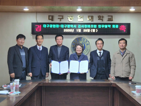 대구공업대학교(총장 이별나)와 대구광역시자동차검사정비사업조합(이사장 박상하)은 지난 26일 대구공업대학교 1호관 2층 세미나실에서 산학협력 협약서(MOU)를 체결했다.