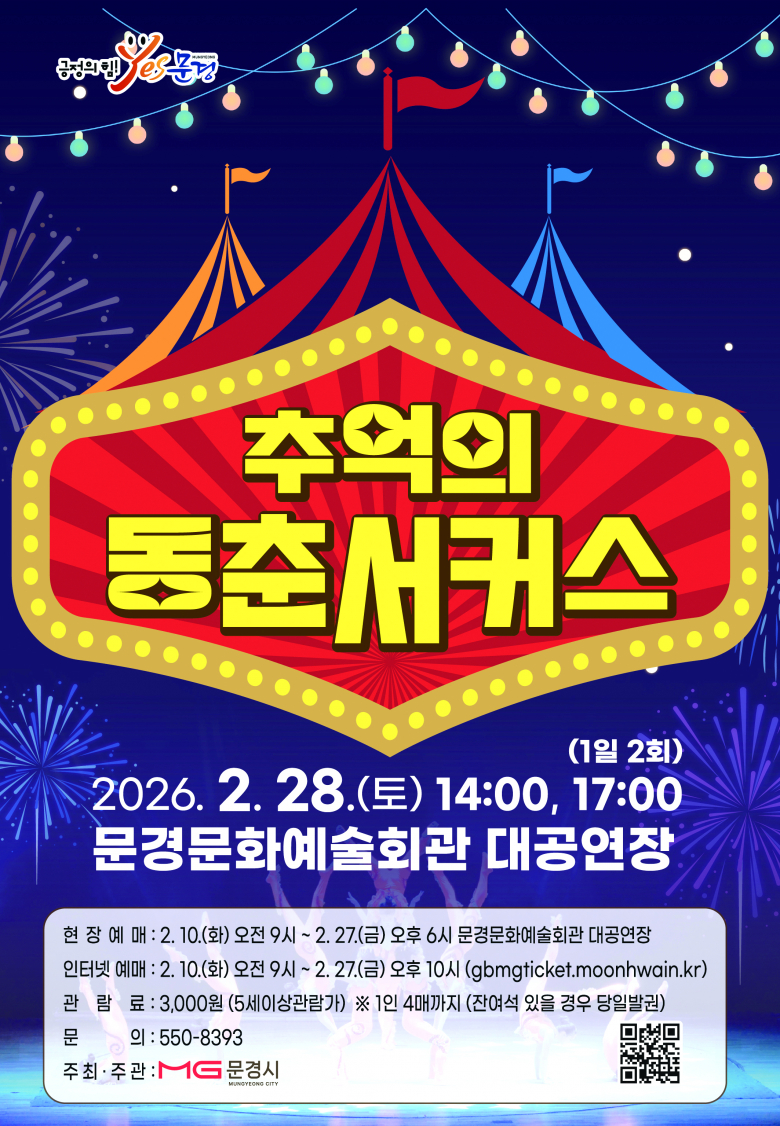 문경문화예술회관에서는 가족 연인 직장 동료들과 함께 재미있게 볼 수 있는 추억의 동춘서커스 공연을 2월 28일 (1일2회)에 문경문화예술회관 대공연장에서 개최한다. 이번 추억의 동춘서커스 공연은 100년이 넘는 역사를 가진 동춘서커스단의 다양한 레퍼토리 중 하나로 전통적인 곡예와 묘기 위주의 서커스에 예술성을 가미한 현대적인 서커스, 기계체조, 곡예, 무용, 마술, 음악이 결합되며 15개의 공연으로 진행된다.숙련된 곡예사들이 박진감 넘치는 아슬아슬한 연기와 짜릿한 연기로 문경 관객들의 이목을 집중 시키며 다양한 세대가 함께 즐길 수 있는 공연이 될 것으로 예상된다. 입장권은 전석 3,000원(5세이상관람가)이며, 오는 2월 10일(화) 오전9시부터 현장예매(대공연장)와 인터넷예매(http://gbmgticket.moonhwain.kr)가 가능하다. 자세한 사항은문경시청홈페이지(https://www.gbmg.go.kr/)에서확인할수있다.(☎문의 :054-550-8393)