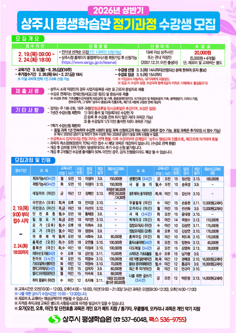 상주시 평생학습원은 시민들의 자기 계발과 평생교육 기회 확대를 위하여 2026년 상반기 평생학습관 정기과정 수강생을 모집한다.이번 상반기 정기과정은 시민들의 교육 수요를 반영하여 총 35개 강좌로 구성되었으며, 모집 인원은 503명이다. 교육과정은 △네일아트 외 직업능력 강좌, △라인댄스 외 문화예술 강좌, △집밥요리 외 인문교양 강좌 등 시민들의 실생활에 도움이 되는 다채로운 프로그램으로 운영할 예정이다.수강 신청은 2월 19일부터 2월 24일까지 상주시청 홈페이지 통합예약시스템(https://www.sangju.go.kr/ reserve)을 통해 인터넷 선착순으로 진행된다.상주시에 주소를 둔 시민이나 상주 소재 직장인이라면 누구나 신청할 수 있으며, 수강료 2만원과 재료비 및 교재비는 수강생 본인 부담이다. 상주시 평생학습원은 매년 상․하반기 정기과정을 통해 시민들의 질 높은 교육 서비스를 제공하며 평생학습 문화 확산에 앞장서고 있으며, 특히 이번 과정은 트렌드를 반영한 신규 강좌를 보강하여 학습자들의 만족도를 높일 것으로 기대된다.상주시 평생학습원 관계자는 “시민들이 일상속에서 배움의 즐거움을 느끼고 개인의 역량을 강화할 수 있도록 알찬 프로그램을 준비했다” 며 “선착순으로 모집이 진행되는 만큼 관심 있는 시민들의 빠른 신청을 바란다”고 전했다. 기타 자세한 사항은 상주시 평생학습원 홈페이지 공지사항을 참고하거나 평생교육팀(054-537-6048)으로 문의하면 된다.