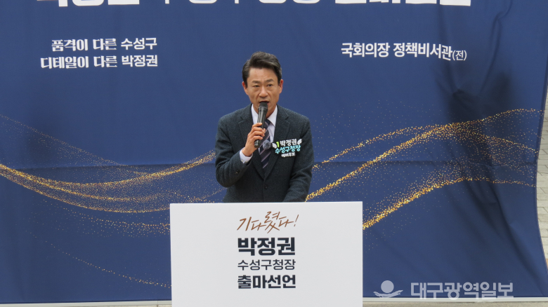 박정권 수성구청장 예비후보가 26일 대구 수성구 범어도서관 야외광장에서 기자회견을 열고 수성구청장 출마를 공식 선언했다.