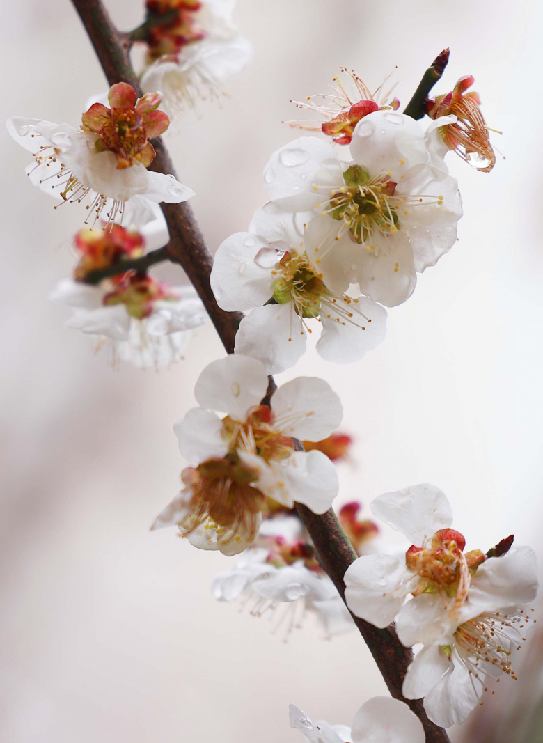 3일 대구 장동초등학교 교정에 핀 매화에 전날부터 내린 빗방울이 맺혀있다. 연합뉴스