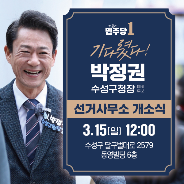 박정권 수성구청장 예비후보가 오는 3월 15일(일) 오후 12시, 대구 수성구 달구벌대로 2579 소재 선거사무소에서 개소식을 열고 본격적인 선거 행보에 박차를 가한다.