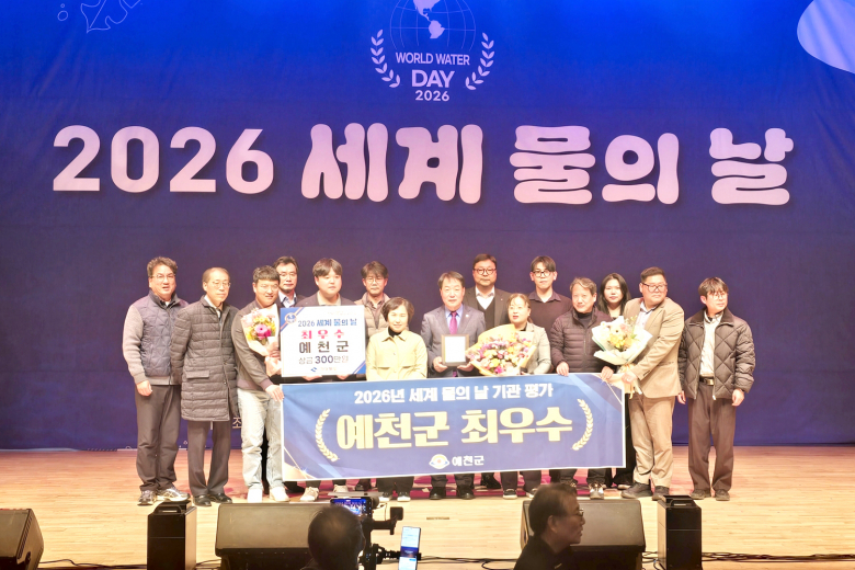 예천군은 ‘세계 물의 날 기념 평가’에서 ‘최우수’ 기관으로 선정되어, 20일 구미시 강동문화복지회관에서 열린 ‘2026년 세계 물의 날 기념행사’에서 기관 표창을 수여받았다.경상북도가 주관한 ‘세계 물의 날 기념 평가’는 물 산업 육성, 상수도, 하수도 등 3개 분야 15개 항목과 도정 협력도 등에 대해 종합적으로 심사가 이루어졌다.예천군은 각 분야에서 고르게 높은 점수를 획득함과 함께 안심하고 마실 수 있는 수돗물 확대 공급과 하수도 보급률 증가 등을 인정받아 군 부문 최우수 기관으로 이름을 올렸다.예천군 관계자는 “이번 최우수 기관 선정은 전 직원이 합심하여 노력한 결과”라며 “앞으로도 선진적인 물 관리 정책을 지속적으로 추진해 군민들이 안심하고 마실 수 있는 깨끗한 물 순환 체계를 구축하는 데 최선을 다하겠다”고 밝혔다.