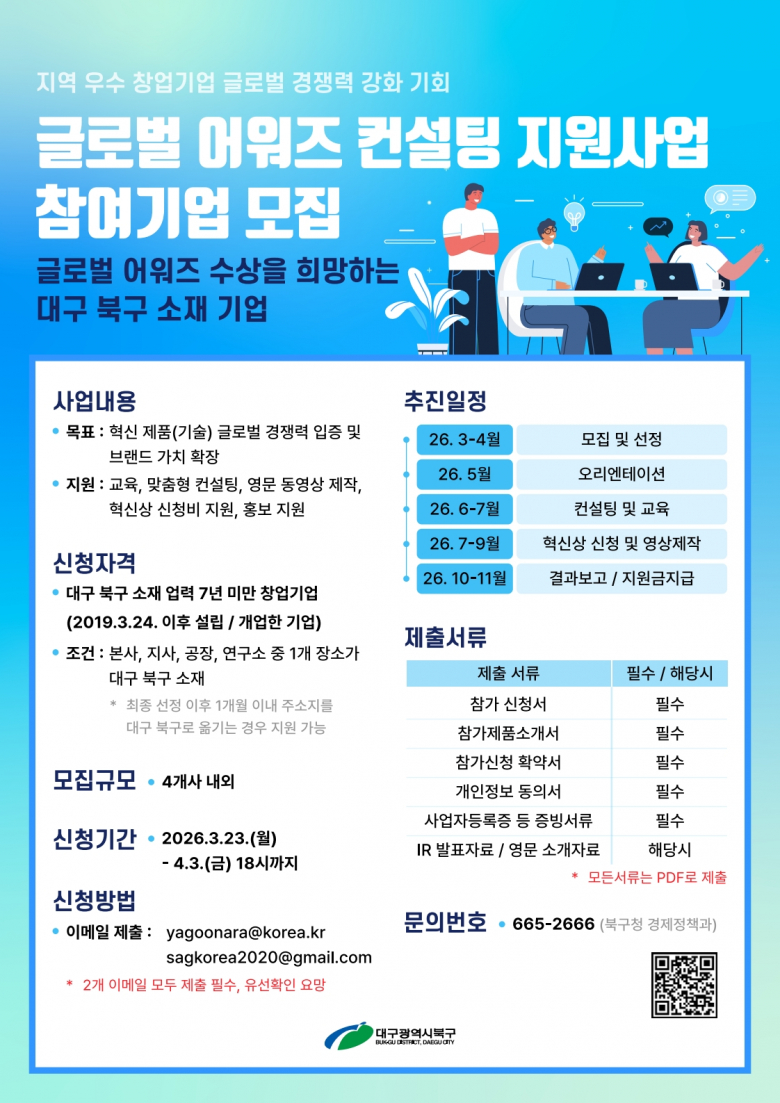 대구 북구청(청장 배광식)은 혁신적인 기술과 제품을 보유한 지역 창업기업의 글로벌 경쟁력 강화를 돕기 위해 ‘글로벌 어워즈 컨설팅 지원사업’의 참여기업을 오는 4월 3일(금)까지 모집한다.