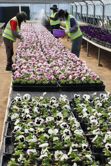 24일 오후 부산 부산진구 백양산 양묘장에서 구청 관계자들이 봄초화를 가꾸고 있다. 부산진구청은 팬지 2만2000본, 크리산세멈 1만3000본, 튤립 8000본 등 봄초화 4만3000본을 관내 거리 화단 조성에 활용할 예정이다.연합뉴스