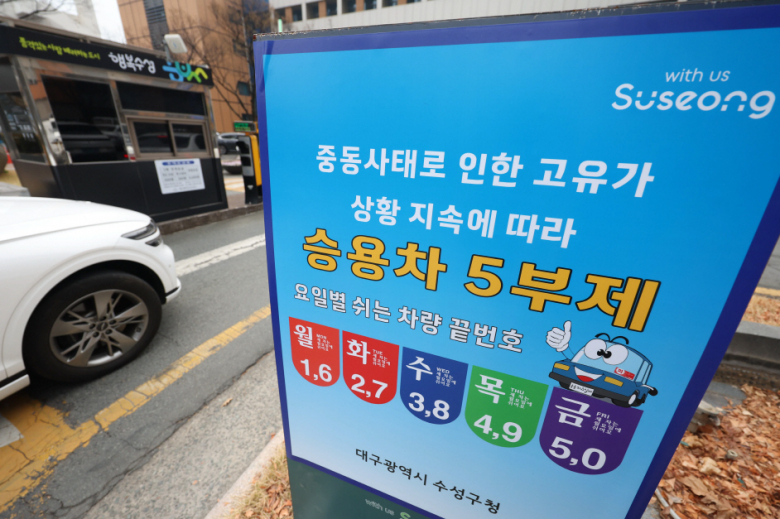 정부가 에너지 절약을 위해 공공부문 `승용차 5부제(요일제)`를 강화하기로 한 가운데 25일 오전 대구 수성구청 출입구에 관련 사항을 알리는 안내문이 설치돼있다.연합뉴스