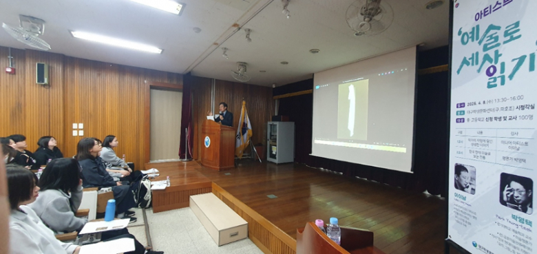 대구시교육청 산하 대구학생문화센터(관장 권원희)는 지난 4월 8일(수), 대구학생문화센터(구. 파호초)에서 학생 및 교사 100명을 대상으로 진로 탐색과 예술적 사고 확장을 위한 진로연계 아티스트 토크 “예술로 세상 읽기”를 개최했다. 이번 프로그램은 예술을 단순한 표현 활동이 아닌, 세상을 이해하고 해석하는 하나의 방식으로 접근할 수 있도록 기획되었으며, 창작자와 평론가의 시선을 함께 경험하는 특별한 구성으로 운영되었다. 1부 강연에서는 미디어 아티스트 이이남 작가가 참여하여 전통 회화를 디지털 기술로 재해석하는 자신의 작업 과정을 소개하고, 예술가로서 세상을 바라보는 시선과 창작의 의미를 학생들과 공유했다. 학생들은 작가의 작업 과정과 진로 이야기에 깊은 관심을 보이며 자신만의 시선으로 예술을 이해하려는 적극적인 모습을 보였다. 이어진 2부에서는 미술평론가 박영택이 “한국 현대 미술로 보는 전통”을 주제로 강연을 진행했다. 전통이 시대의 관점 속에서 끊임없이 해석되고 재구성된다는 내용을 중심으로 한국 현대 미술을 이해하는 새로운 시각을 제시했으며, 학생들은 강연 내내 집중하며 질문을 이어가는 등 높은 몰입도를 보였다. 또한 근대화 과정에서 형성된 전통 개념과 ‘한국적인 것’에 대한 다양한 해석을 통해 예술을 보다 깊이 있게 바라보는 계기를 마련했다.황태용 기자