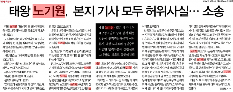 태왕 노기원, 본지 기사 모두 허위사실···소송
