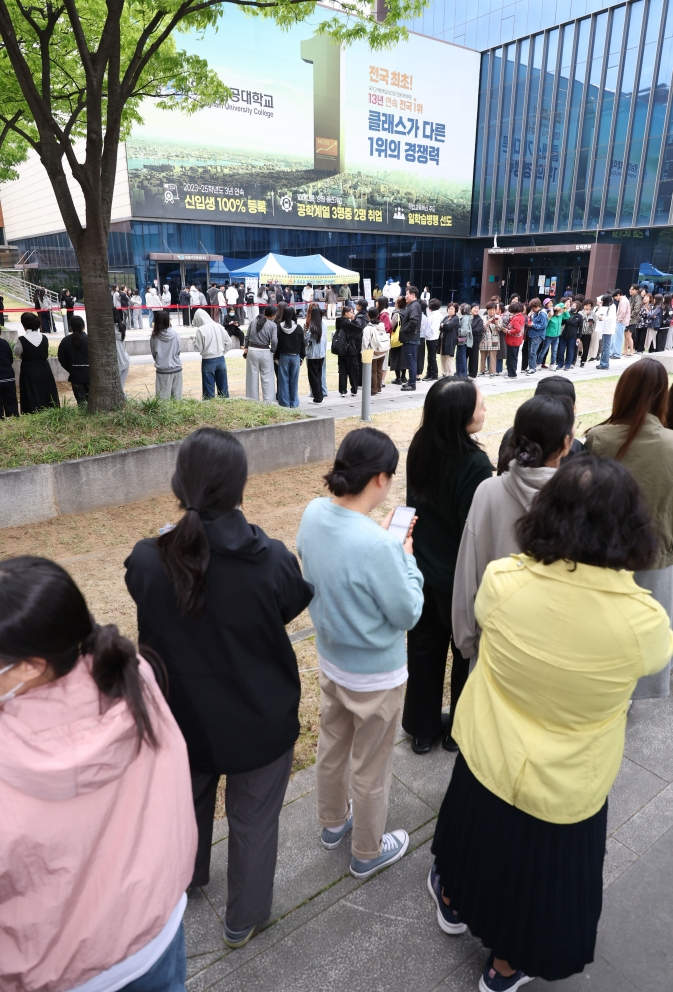 14일 대구 남구 영남이공대학교 천마스퀘어 잔디광장에서 `A+를 부르는 링크(LYNC) 간식데이` 행사가 열리고 있다. 행사에서 재학생들이 줄지어 간식을 기다리고 있다. 영남이공대는 이날 중간고사를 맞아 간식과 음료 550인분을 준비해 학생들을 응원하며 나눠줬다.연합뉴스