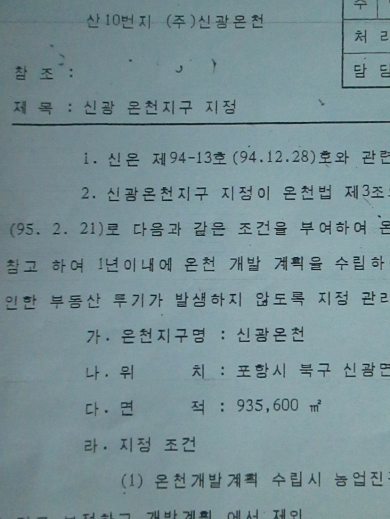 주 내용은 1995년 2월 포항시는 북구 신광면 반곡리 일대 93만5,600㎡ 면적을 신광 온천지구로 지정해 달라는 (주)신광온천의 고시했음에도 이후 개인 업체에서 개발권을 가지게 된 갑작스런 배경에 대해 초점이 맞춰질 것이란 분석이다.